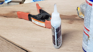 In a typical stitch and glue boat, the sides would be stitched to the bottom and bulkheads using copper of steel wire stitches. The Clancy calls it's method stitch and glue, but it is not the same process. Instead of stitching, the side panels are first screwed into the stem, and then you work aft, pushing the panel against the bottom panel and tacking them together with glue. The Clancy instructions call for using hot glue, but I used dabs of superglue, spritzed with accelerant instead: it is faster, the bond is a little stronger, and you are not left with globbies of hot glue everywhere.