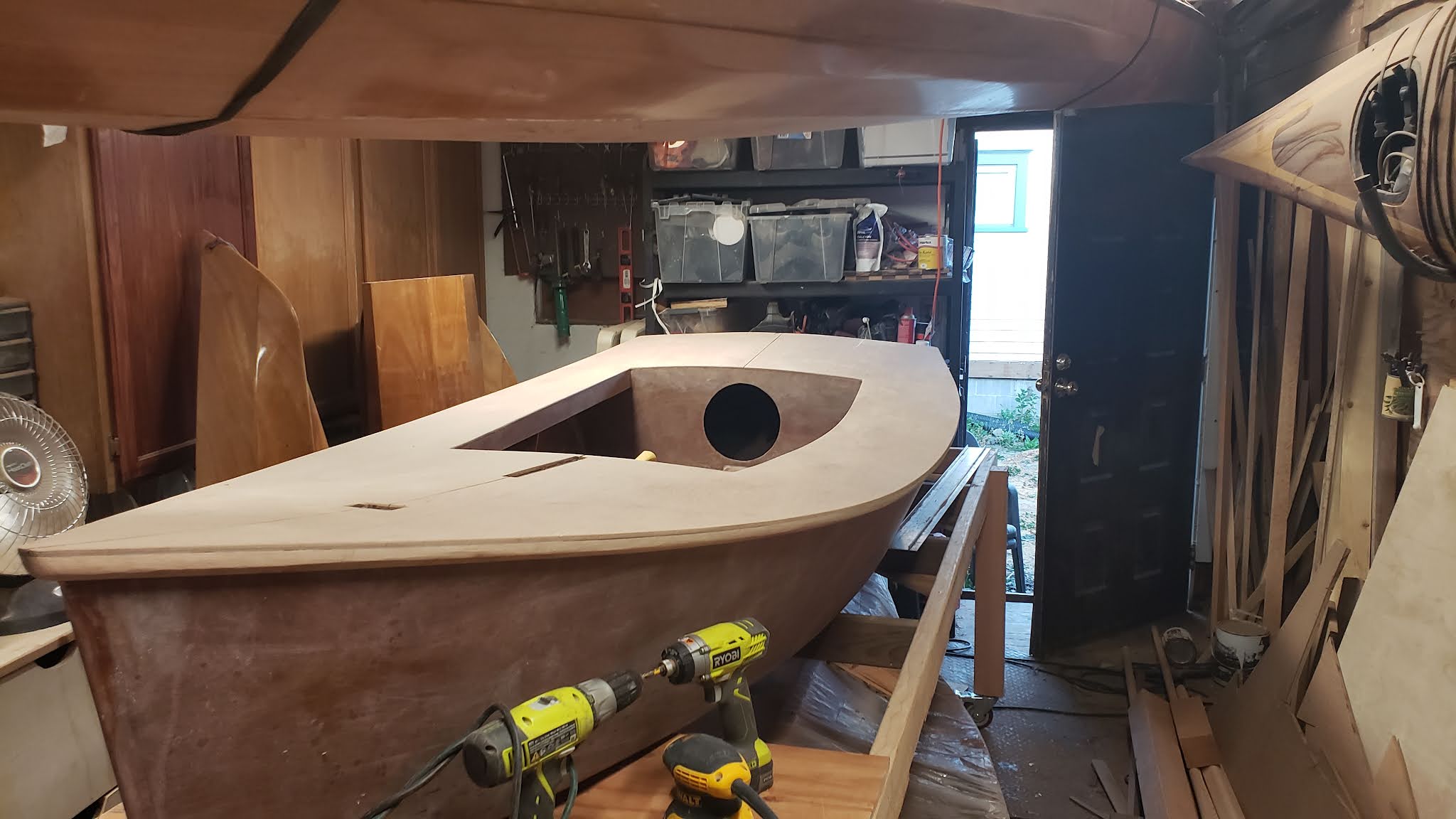 With al the supporting structure in place, the boat is ready for the deck to be installed. The undersides of the deck get sealed with two coats of epoxy prior to installing the deck.